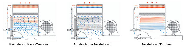 Kombinierte Nass/Trocken-Betriebsart Die zu kühlende Flüssigkeit gelangt zuerst in die Rippenrohrschlange an der Druckseite, wo sie von der Abluft vorgekühlt wird. Danach gelangt die Flüssigkeit in die Glattrohrschlange, die vom Sprühsystem befeuchtet wird. Mittels Verdunstungskühlung wird die Flüssigkeit auf die gewünschte Austrittstemperatur gekühlt. Bei dieser Anordnung können bereits bei Spitzenlast erhebliche Wassereinsparungen erreicht werden. Bei geringerer Wärmelast und/ oder niedrigeren Umgebungstemperaturen moduliert das Drei-Wege-Ventil (optional), das von der angenommenen Flüssigkeitsaustrittstemperatur gesteuert wird, den Fluss durch die befeuchteten Glattrohrschlangen. Wenn sich der Fluss und die Wärmelast für die befeuchtete Glattrohrschlange verringern, erfolgt immer weniger Verdunstungskühlung und eine erhebliche Wassermenge wird eingespart.